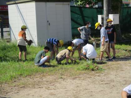 蘭秀っ子の全学年が順番に、夏に伸びたグラウンドの雑草の草とりに取り組んでいます。今日は6年生が除草を行いました。学校のために休み時間にもがんばっている最高学年です。