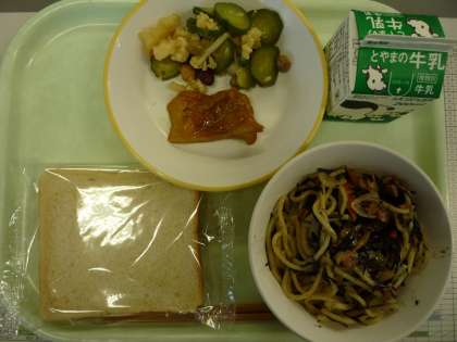 食パン 照焼きチキン ビーンズサラダ ベーコンとひじきの和風スパゲッティ 牛乳