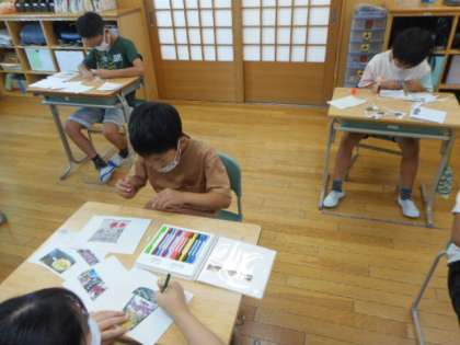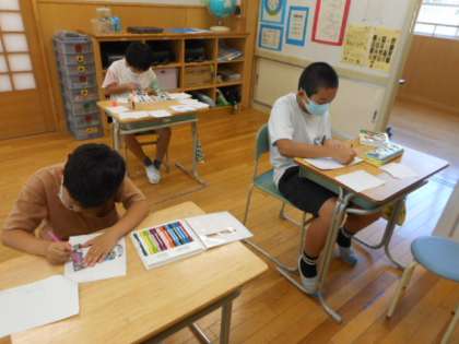 生活単元学習の時間にひまわりマーケットを開くための準備をしています。「お客さんが喜ぶ商品をつくろう」を合い言葉に、「きれいに色を塗ったらいいと思う」「大きいパンののほうが、おなかがいっぱいになるから大きく描く」など、お客さんのことを考えながら、それそれ工夫して商品をつくりました。