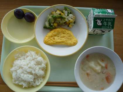 ごはん オムレツ アスパラサラダ 白いんげん豆のシチュー 巨峰 牛乳