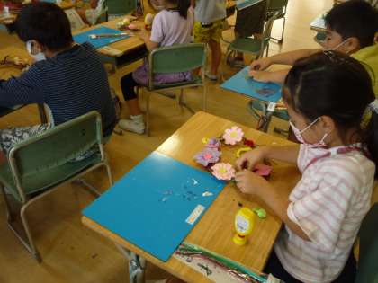 魚やおばけ、花等いろいろな飾りを紙粘土で作り、リースにつけました。飾るのがとても楽しみです。
