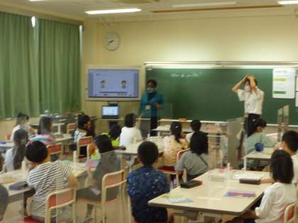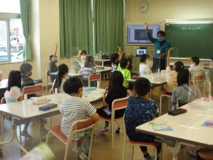 楽しく外国語活動に取り組んでいます。ジェスチャーを使って、気持ちが伝わるようにしました。