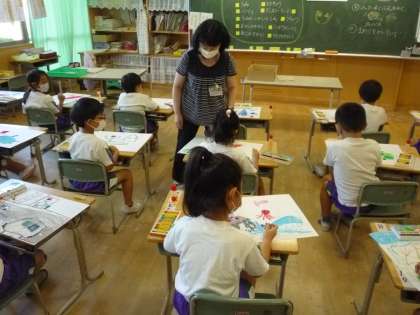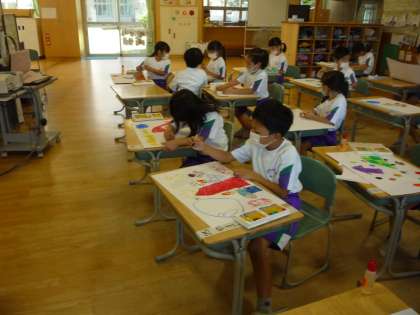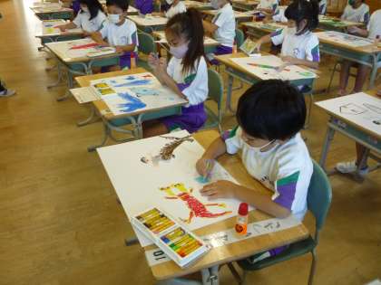 先ずは、クレヨンでいろいろな世界を想像して描きました。この後は、水彩に挑戦します。