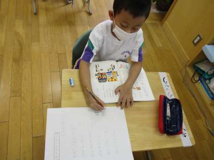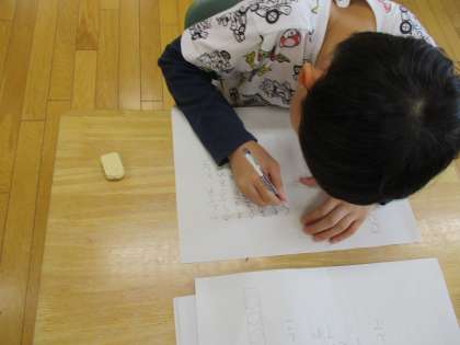 国語の教科書に載っている詩を、丁寧に視写しました。間違わないようにと、何度も読み返し最後まで書きました。「はあ、疲れた」と言いながらも、完成を喜んでいました。教室の後ろの壁に掲示しました。