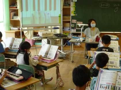 鍵盤ハーモニカの学習では、正しい指の使い方や吹き方を勉強しました。先生の出す音や音楽に合わせて、楽しく練習しました。