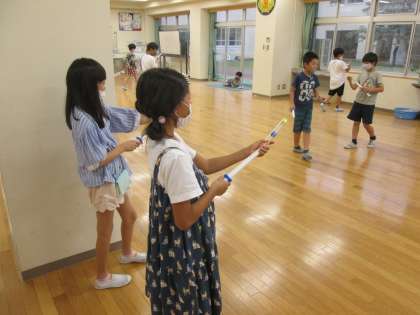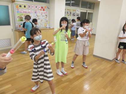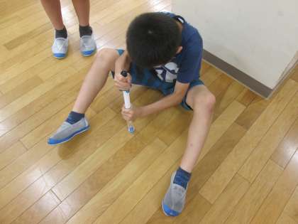 空気鉄砲を使って弾を飛ばして、押し縮められた空気について考えました。弾を遠くに飛ばすにはどうすればよいか試行錯誤しながら実験しています。