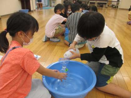 実際に容器に水を入れ、2種類の容器に入る水の体積を比べました。