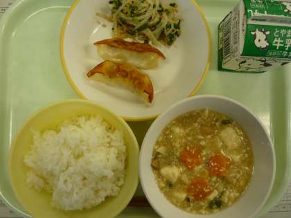 ごはん 焼きぎょうざ ナムル えびと豆腐のうま煮 牛乳