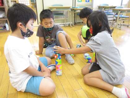 学活の時間に、お楽しみ会をしました。「みんなでなかよくする」を目当てに、この前図工でつくった紙サイコロをどこまで積めるかゲームをしたり、だるまさんがころんだゲームをしたりしました。また、やりたいです。