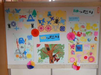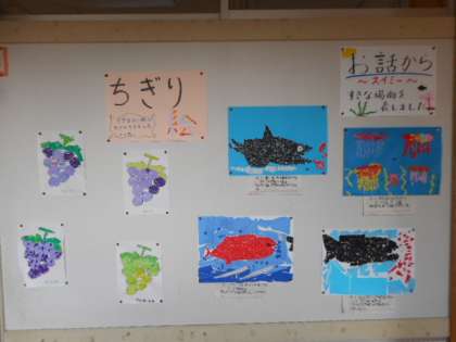 図工の時間に取り組んでいたスイミーのちぎり絵が完成しました。またわくわくの時間につくっていた飾りを一つにまとめて飾りました。ちぎり絵はそれぞれに場面を思い浮かべながら、少しずつ丁寧にちぎって貼りを繰り返しました。どの作品も思いがこもった作品に仕上がりました。また飾りは一つ一つは小さな飾りですが、まとめて飾ることで、ダイナミックな飾りになりました。今回の飾りづくりを生かして、教室以外の場所も飾っていこうと考えています。