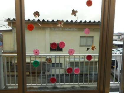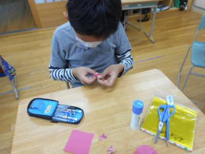 みんなで花の飾りをつくりました。きれいに折ったり切ったりすることを目当てに取り組みました。なかなか角や辺と辺が合わなくて四苦八苦する場面もありましたが、「きれいに折ってきれいな飾りをつくりたい」という気持ちが伝わってきました。早速教室に飾ると、満足そうにしていました。