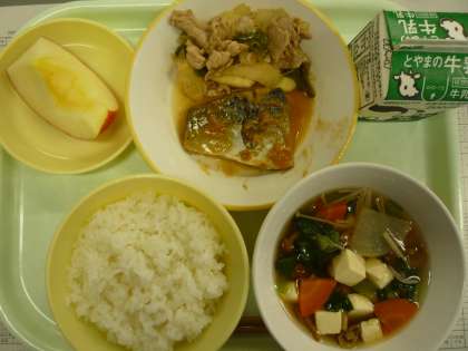ごはん さばのみそ煮 マコモタケのオイスターソース炒め きのこ汁 りんご 牛乳