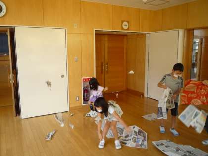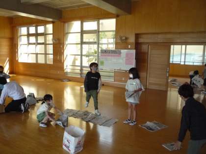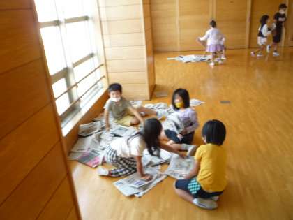 「新聞となかよし」の学習では、新聞を破ったり、破った新聞を頭の上に降らせてみたりして、新聞とふれ合ってみました。