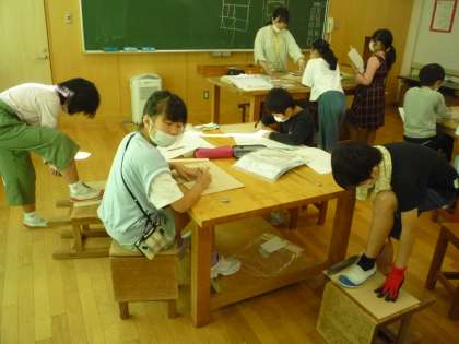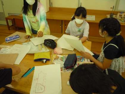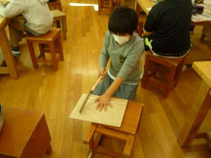 のこぎりで板を切りました。初めての学習で、なかなかうまく切れないようです。のこぎりの切るコツを見つけていきます。