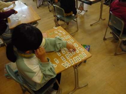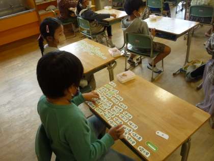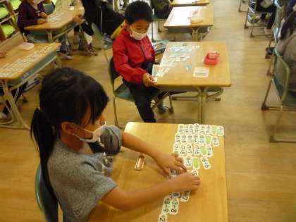 足し算カードを使って、足し算の不思議を見つけています。並べると「階段みたいになっている」とつぶやいていました。