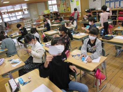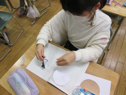 算数科「まるい形を調べよう」の学習では、初めてコンパスを使い、円をかきました。きれいな円をかけるように特訓中です。