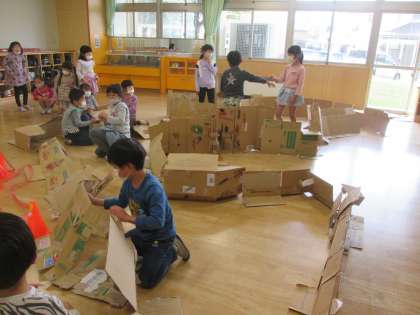 ゲーム係が作った段ボール迷路で楽しみました。係の友達とじゃんけんをして、勝ったら好きなコースに進めます。
