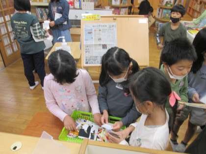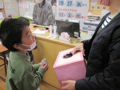図書委員会の企画のクイズは全問正解すると、くじ引きができるということで、はりきってチャレンジしました。見事、全問正解した子供たちは、わくわくしながらくじを引き、素敵な景品をゲットしていました。どんな物が当たるかは、引いてからのお楽しみです。