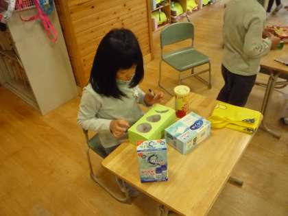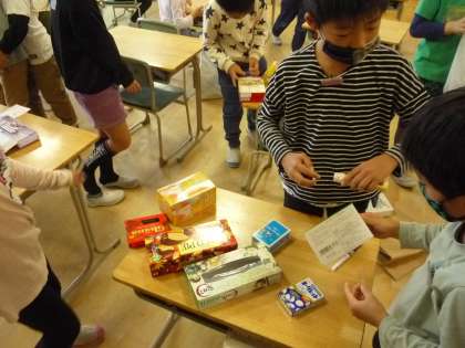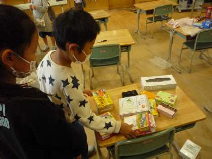 図形の学習では、家から持ってきたいろいろな形の箱を比べ、特徴を調べました。