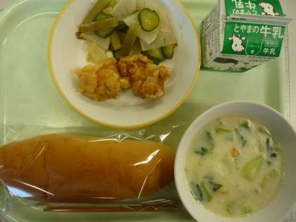 コッペパン フライドチキン 茎わかめサラダ ほたてのクリーム煮 牛乳