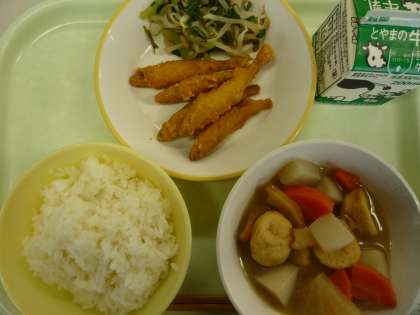 ごはん わかさぎのフリッター 昆布和え おでん 牛乳