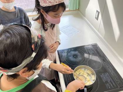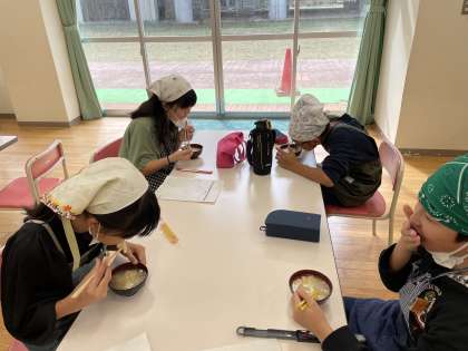 事前に確認した作り方を確かめながら、みそ汁をつくりました。だしが入っているみそ汁とだしが入っていないみそ汁を比べて、「やっぱりだしって大切だね」と話しながら試食していました。