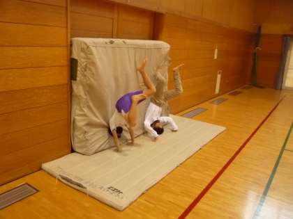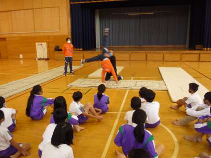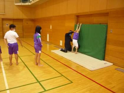 富山大学の准教授佐伯先生と大学生(体操部)を講師に迎え、マット運動の側方倒立回転の授業を行っていただきました。