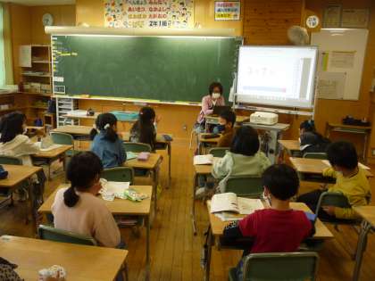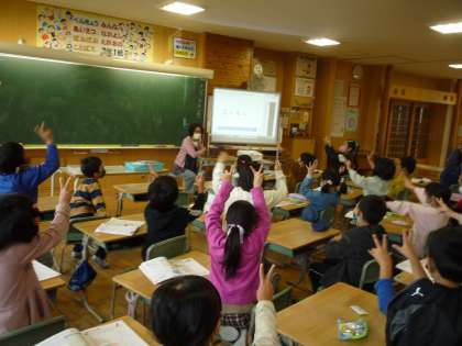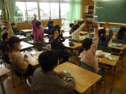 かけ算九九の練習です。ランダムに出てくる九九を素早く答えています。口だけでなく手でも答えを表したりもしています。