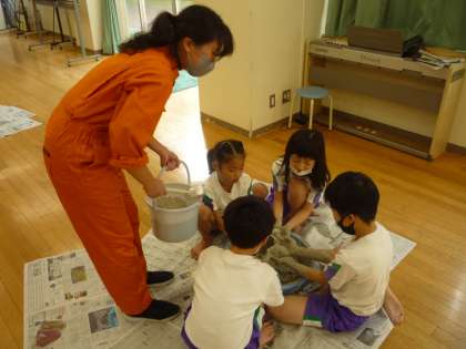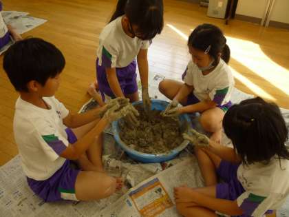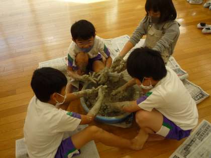 粘土の学習では、まず粉の粘土から水を足し粘土を作るところから始めました。ぐにゃぐにゃの感触が気持ちよさそうです。