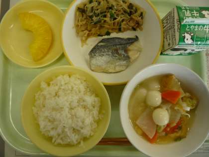 ごはん 鰆の塩焼き しらたきのピリ辛炒め 白玉汁 カットパイン 牛乳