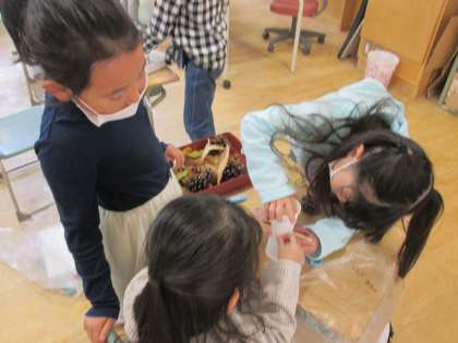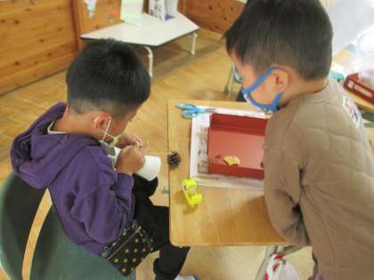 どんぐりや松ぼっくりを使って、秋のおもちゃづくりをしています。互いのおもちゃを見合ったり協力したりしながら、おもちゃづくりを楽しんでいます。