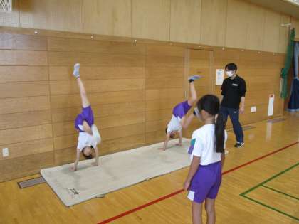 側方倒立回転を成功させるには、倒立が大切であると教えてもらい、壁倒立の練習を中心に取り組みました。練習後には、上達した子供も多くいました。お手本を見たり、みんなで取り組んだりして、とても楽しく活動しました。