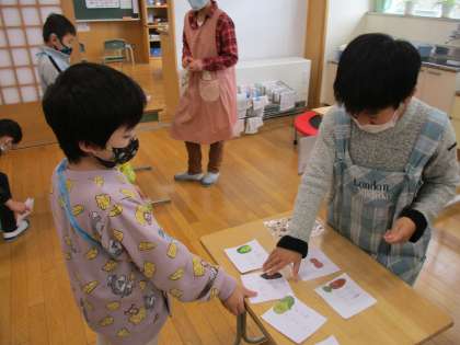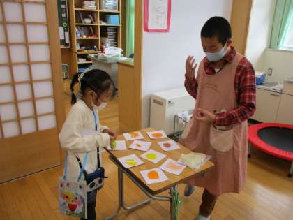「ひまわりマーケット」になかよし級が招待されました。「いらっしゃいませ、いらっしゃいませ」というひまわり級のみんなの大きな声から始まり、100円玉の模型を握りしめたなかよし級のみんなは、緊張しながらも「これください」と買い物をすることができました。「楽しかったね、またやりたいな」「今度は、なかよし商店街にもひまわりさんを呼びたいな」と振り返りました。また交流をしていきたいです。ひまわり級のみなさん、楽しい時間をありがとう!