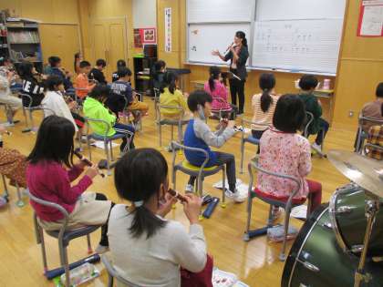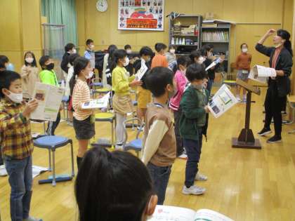 「貨物列車」でウォーミングアップをしてから、リコーダーを練習しました。「トォー」という息の吹き込み方を練習して、「山のポルカ」を演奏しました。それから、「ふじ山」を歌いました。曲の山を意識して歌うと、日本一の山を自慢しているように声が出ました。