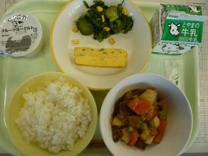 ごはん シイラの黒酢あんかけ エゴマ入り卵焼き 小松菜サラダ ラフランスヨーグルト 牛乳