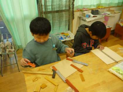 のこぎりで切った板を釘で打ち付けたり、色を塗ったりして作品を仕上げています。