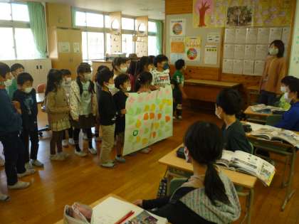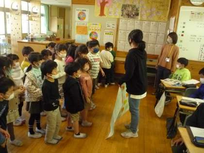 交流会で楽しませてくれた6年生にメーセージを持って、お礼にきました。学級代表がメッセージカードを受け取りました。