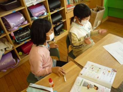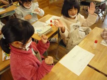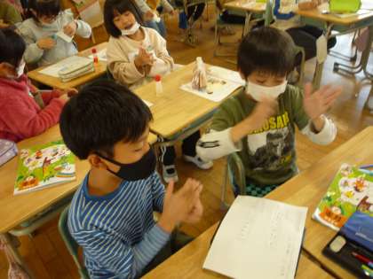 ペアでお互いのリズムを考えて、それを手拍子で合わせる練習をしています。