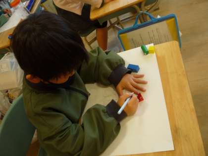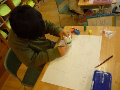 いろいろな箱や缶の形を写し取って、絵を描きました。