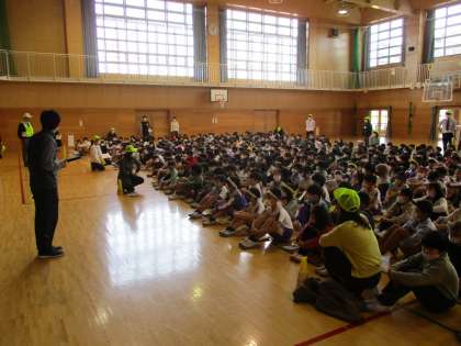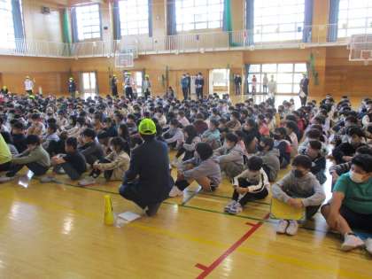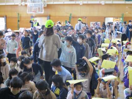 地震を想定した避難訓練を行いました。避難途中に、余震が起きる事も考え、頭を守りながら安全に避難することを心がけました。