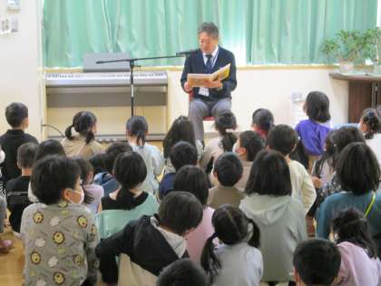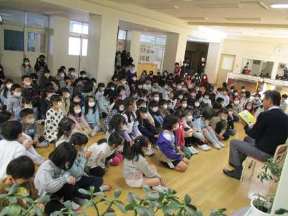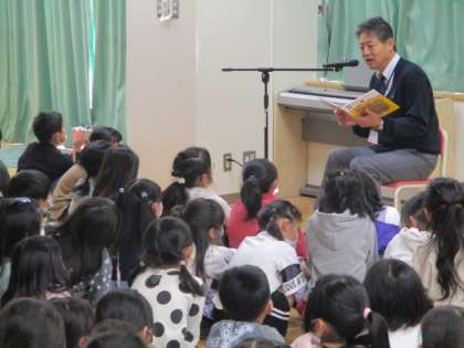 本が大好きな子供になってほしいと、給食時に本の読み聞かせを行っています。今日は、学校司書ではなく、ある先生が読み聞かせをしました。ほんの5分程度でしたが、声色を変えて「どろぼうがっこう」のお話を紹介しました。お話に引き込まれた多くの子供たちが続きを聞きたくて、昼休みにランチルームに集まりました。そこへ登場したのは、校長先生でした。「やっぱり!」と子供たちは大喜び。お話を最後まで笑顔で聴いていました。