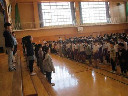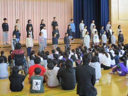 校歌の歌詞に込められている思いや好きな歌詞について話があり、その後きれいな歌声を響かせてくれました。聞きに来ていた子供たちも一緒に歌うなど温かい空気に包まれました。
