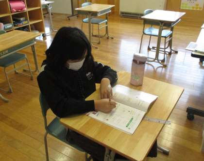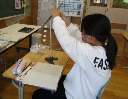 6年生は理科で「てこのはたらき」の学習を行いました。実験用てこを使い、水平につり合うためにはどうすればよいか考えました。3年生は算数でかけ算の学習を行いました。筆算で正しく答えを求めることができました。
