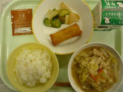ごはん とんこつラーメン 春巻き 華風和え 大豆ふりかけ 牛乳