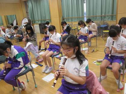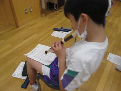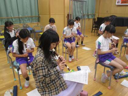 親指をずらして高い音を出す「サミング」の練習に取り組みました。指の使い方や、息の吹き方に気をつけて、きれいな音で演奏しています。