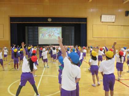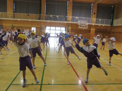 学年体育で、ダンスをしました。「ジャンボリーミッキー」の曲に合わせて、かわいいミッキー、ミニーが楽しそうに踊っていました。