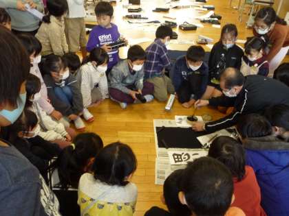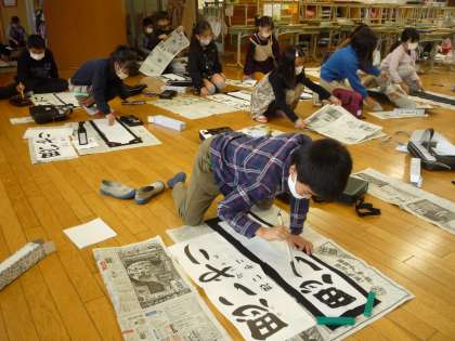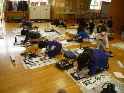書き初めの練習をしました。初めての書き初め用紙に戸惑いながらも、思いっきり書くことができています。