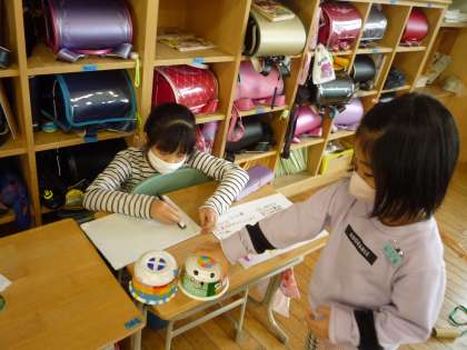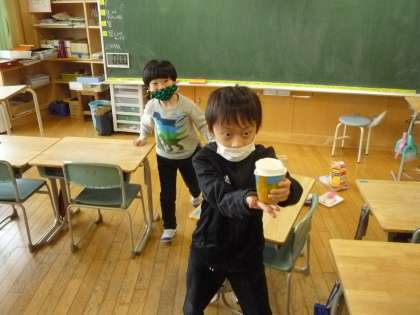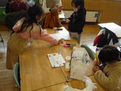 いろいろ試しながら、よりおもしろいおもちゃになるように工夫をしています。できあがったおもちゃを自慢げに見せてくれました。