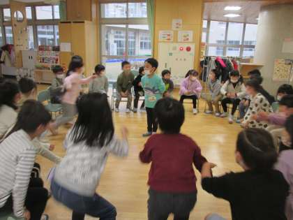 みんなで「フルーツバスケット」をしました。にこにこ笑顔がいっぱいの、楽しい時間になりました。