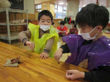 どんぐりやまつぼっくりを使って秋のおもちゃを作りました。